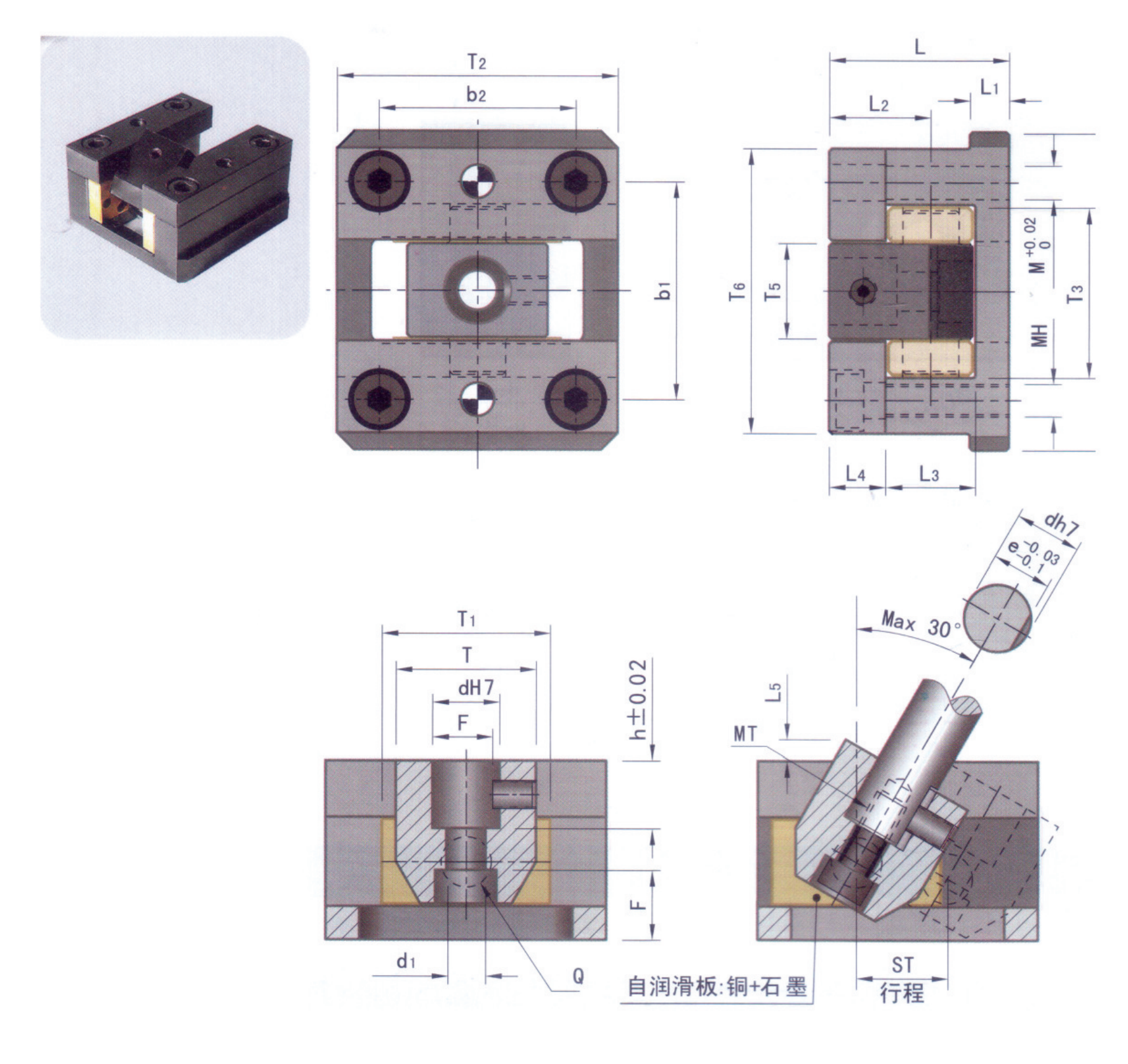 此產品安裝在模具的頂針推板上,需配成形斜推桿,成型后,在推板頂出的過程中通過產品內部機構自潤滑動,在規定的行程內將成型塑膠件內側面凹凸形狀的型芯頂出,使膠件順利脫模.