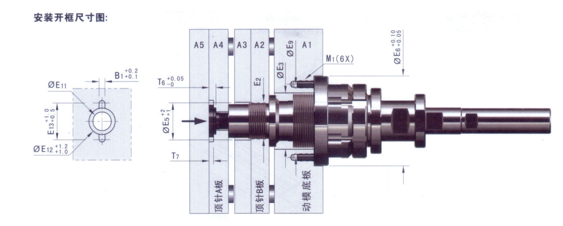 “固定圈”在組裝時已經過加固處理,為保證頂出機構正常使用,在使用前后不可隨意拆卸! 需精準安裝(一套模具上一般安裝一個頂出裝置);行程要計算準確,否則產品容易損壞.